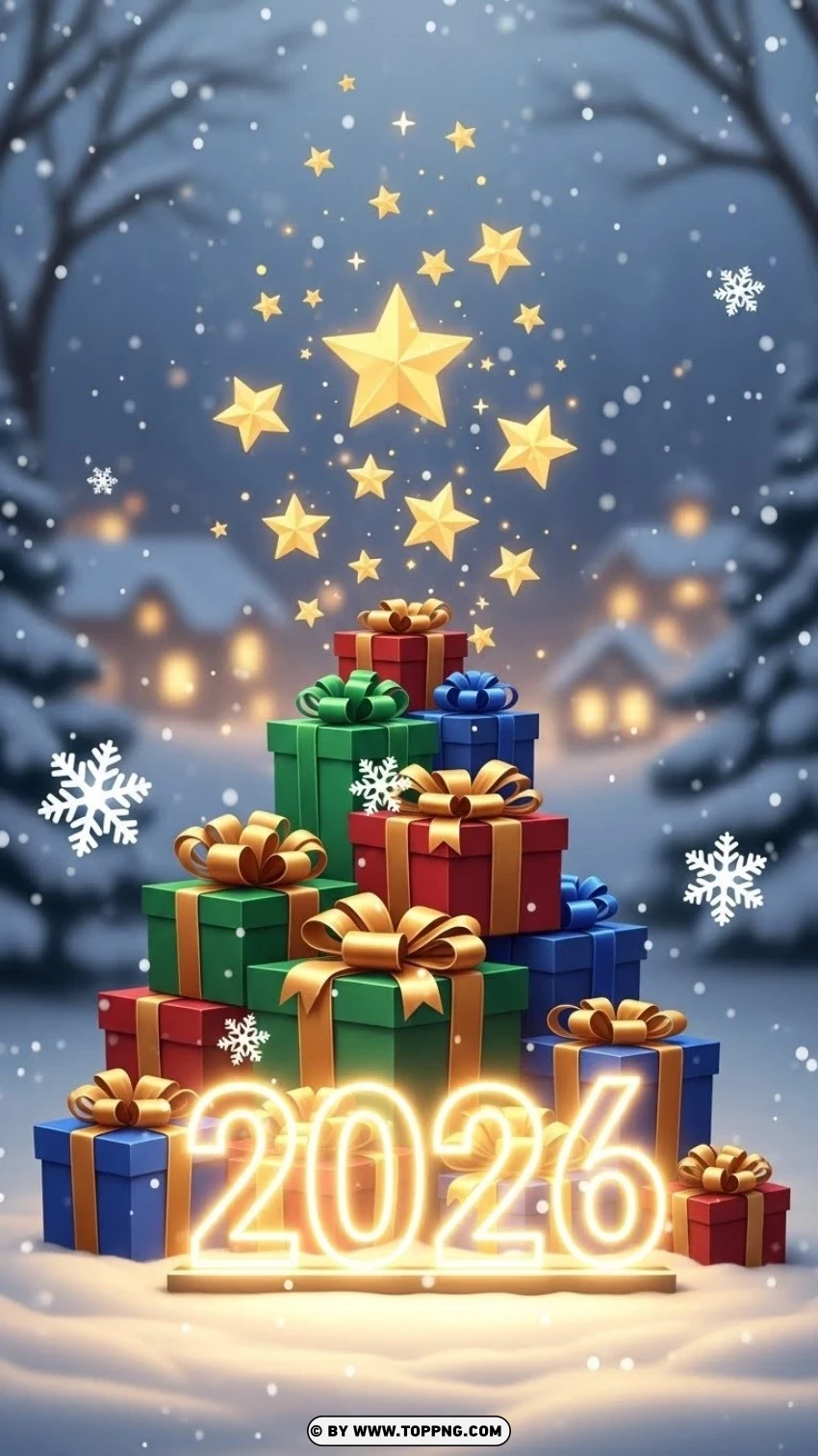 | Title | Festive 2026 Holiday Scene with Gift Boxes and Golden Stars |